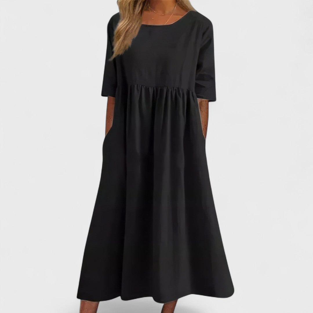 Šaty Sofia vynikají svým minimalistickým, přesto moderním designem. Vyrobené z kvalitní bavlněné směsi, která je jemná, prodyšná a příjemná k pokožce, ideální i v horkých dnech. Střih do áčka s volně padnoucí sukní přirozeně lichotí postavě, zatímco decentní výstřih dodává jemný ženský akcent. Jednoduchost modelu umožňuje snadné stylování – od sandálů po tenisky či doplňky.