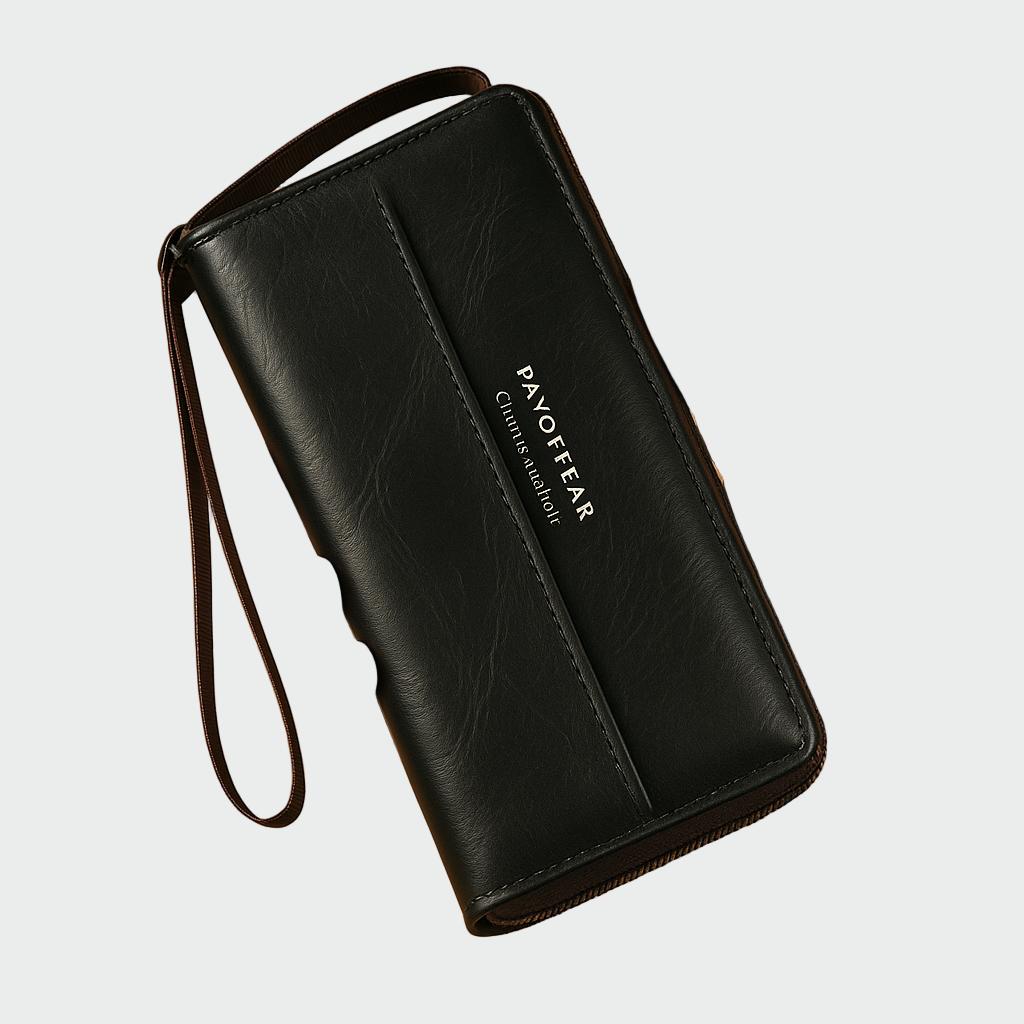Elegantní pánská peněženka v černé barvě s minimalistickým designem a praktickým zápěstním páskem pro snadné přenášení. Obsahuje více přihrádek na karty, hotovost a mince, což poskytuje pohodlí a organizaci v každodenním životě. Kvalitní textura kůže a decentní logo na přední straně dodávají moderní a rafinovaný nádech. Doplněk, který spojuje styl a funkčnost.