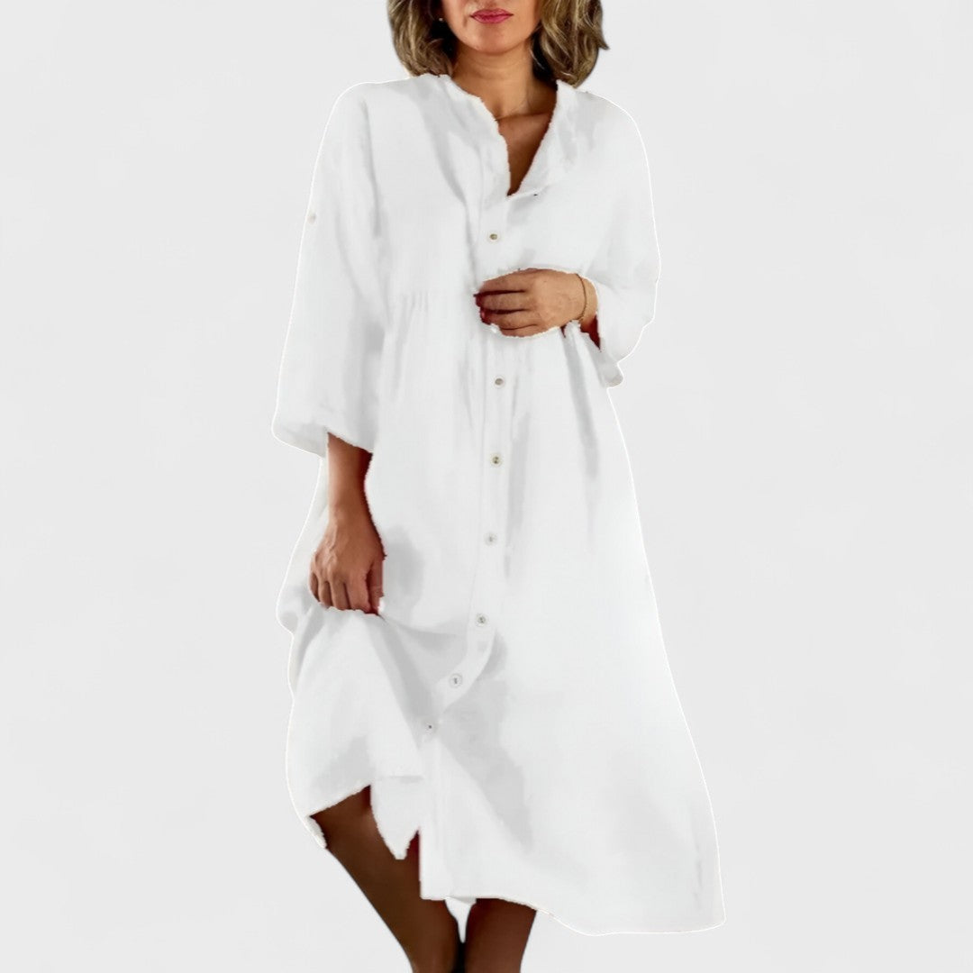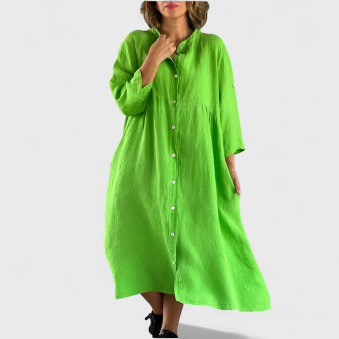 Šaty Isa jsou dokonalým nadčasovým kouskem pro každý den. Jejich vzdušný a příjemný materiál, který kombinuje bavlnu a len, je ideální volbou pro teplé letní dny. Košilový střih s elegantními knoflíky a vázáním v pase vytváří uvolněnou, ale zároveň ženskou siluetu. Jsou perfektní volbou pro procházky po městě, do práce nebo na dovolenou, kde se budete cítit pohodlně a stylově.