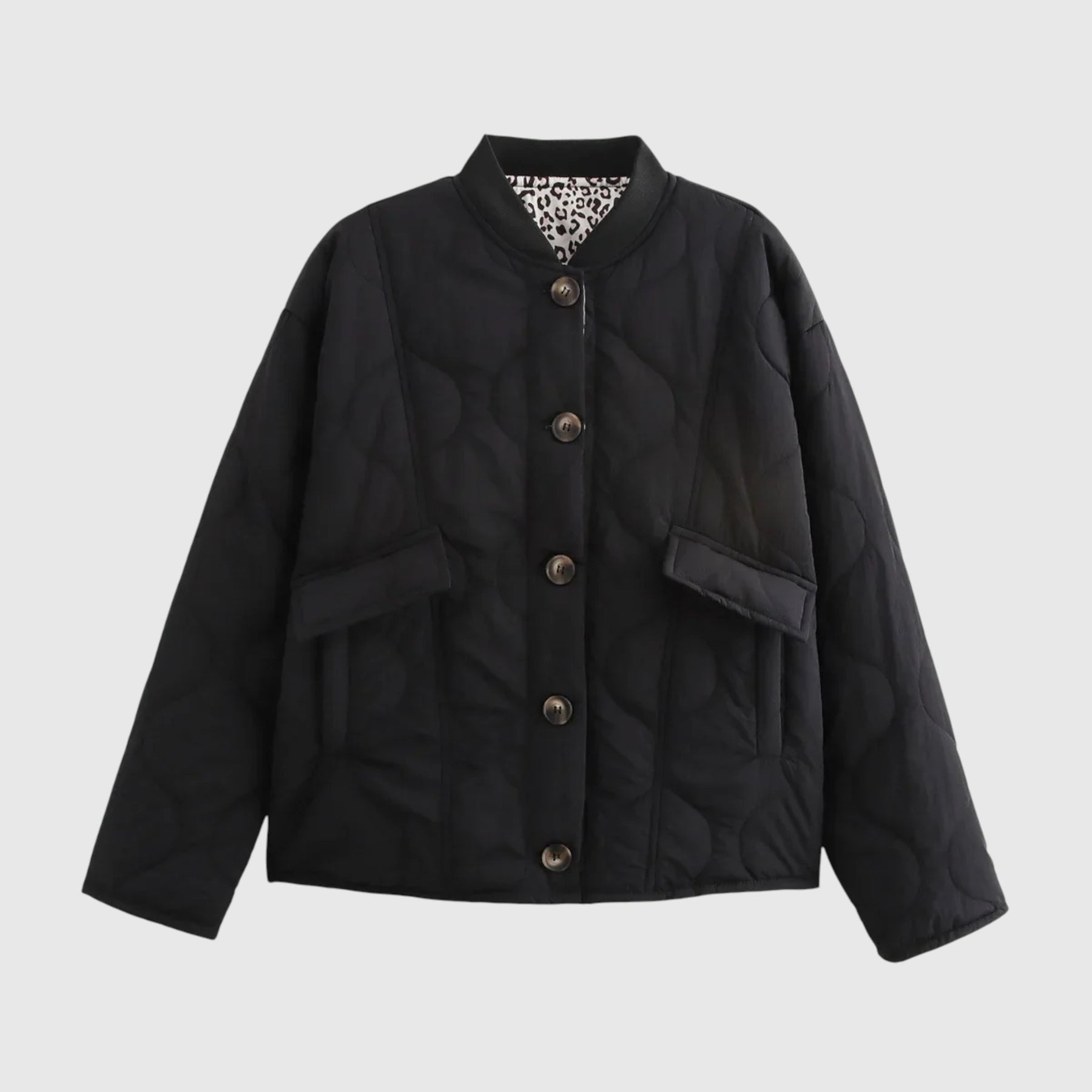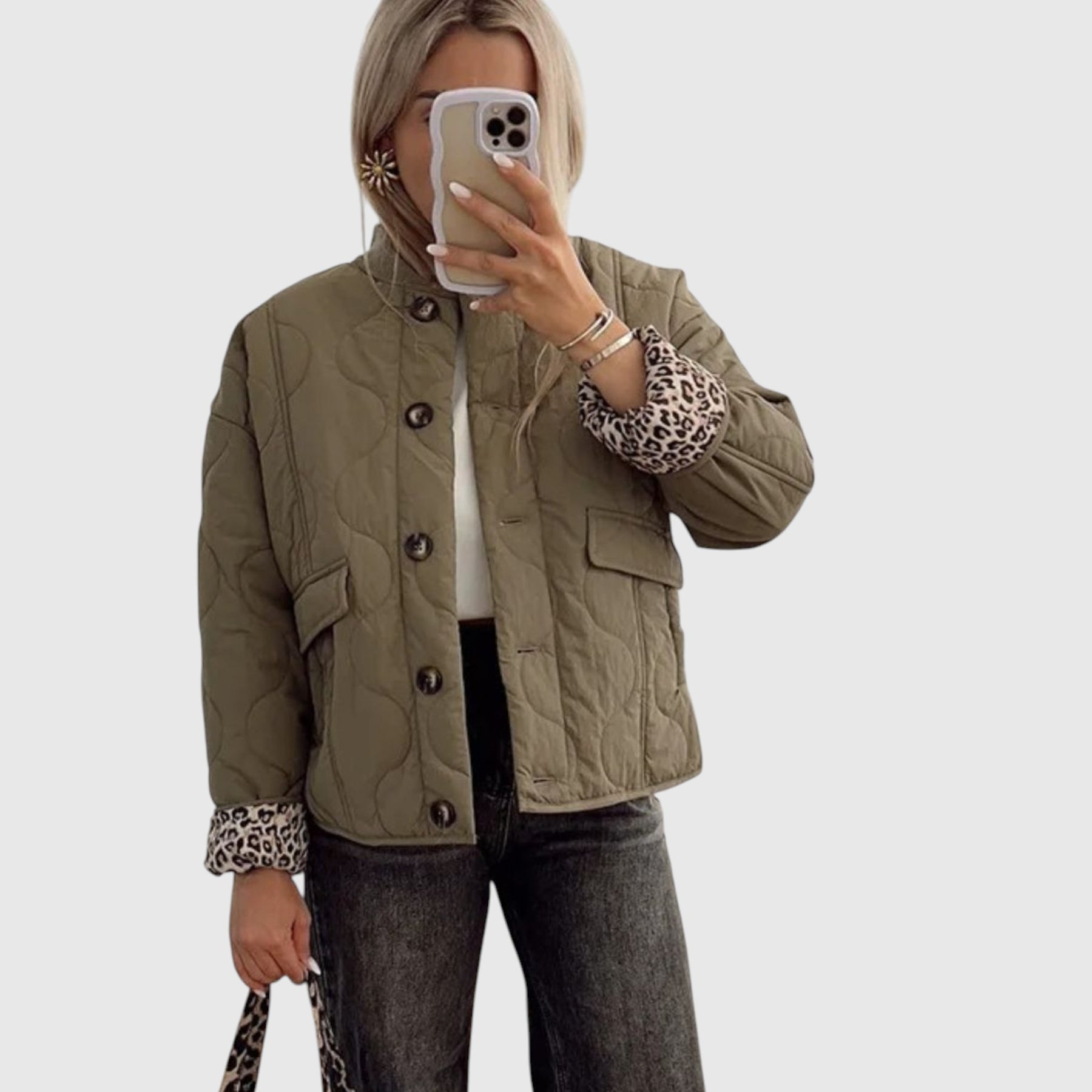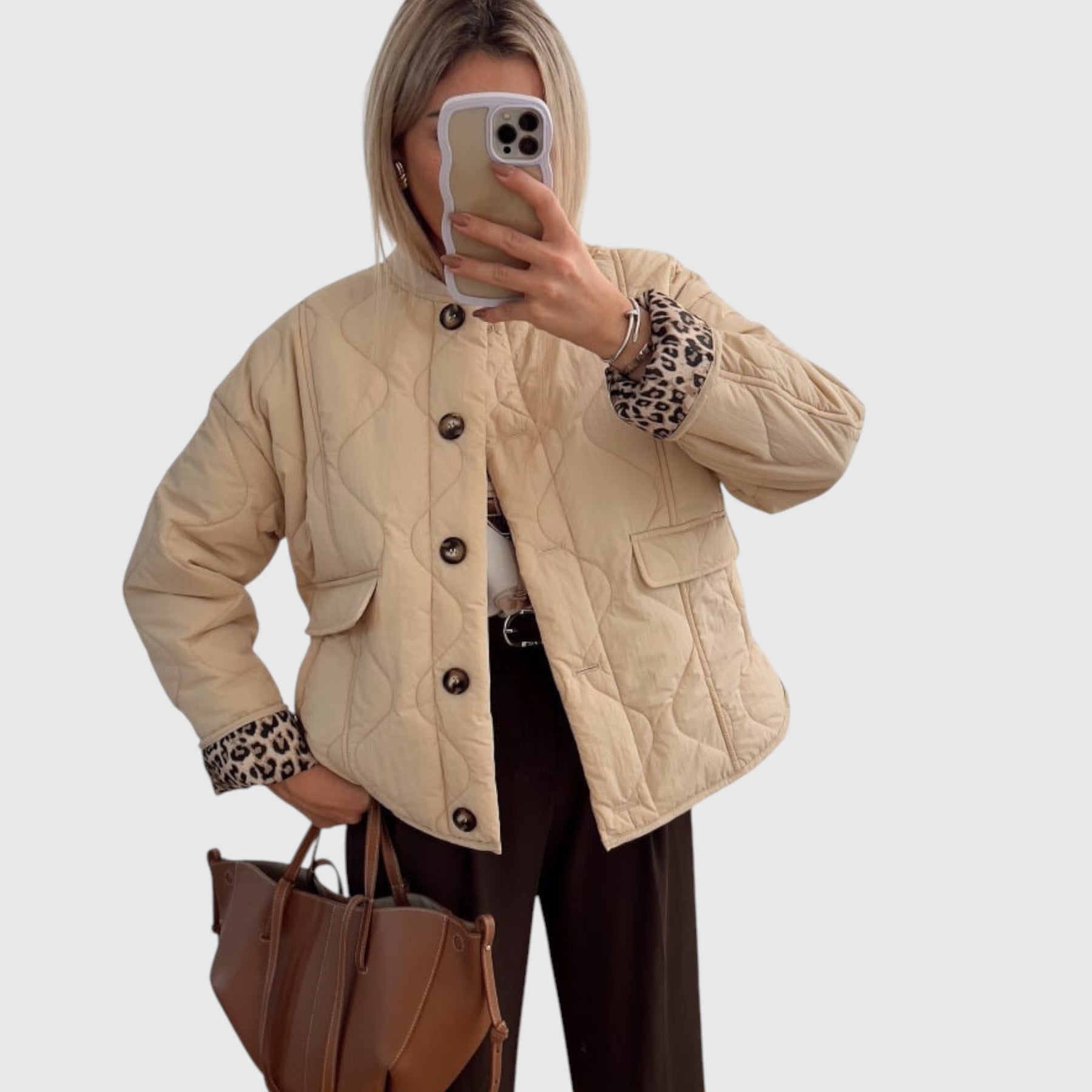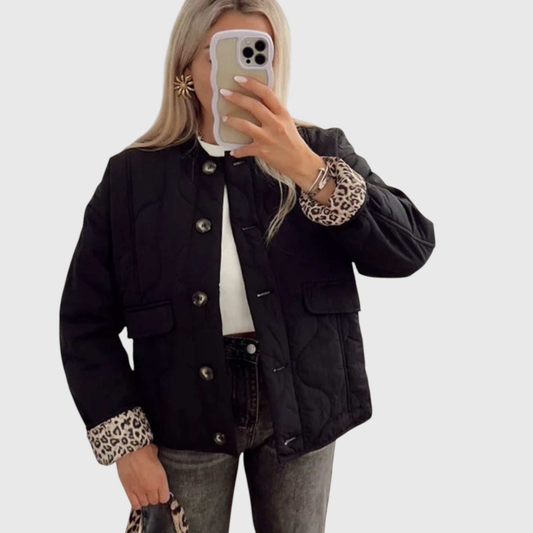 • Stylová leopardí podšívka – Leopardí vzor dodává nádech odvážné elegance, diskrétně viditelný na ohrnutých rukávech nebo výstřihu.