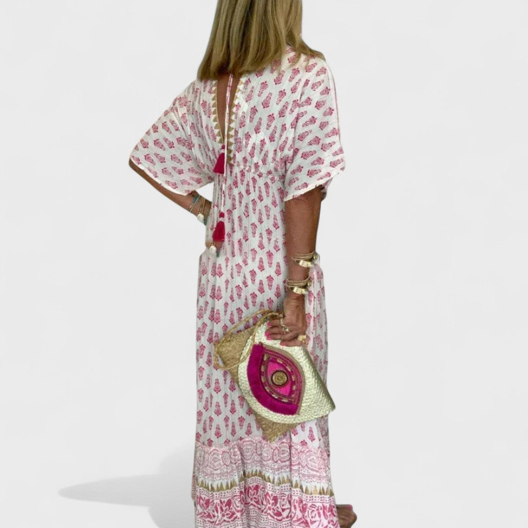 Šaty Mabel jsou ideální volbou pro ženy, které milují bohémský styl a pohodlí. Jsou vyrobeny z lehkého a splývavého materiálu s nádherným potiskem, který se skvěle hodí na letní dny. Volný střih s výstřihem do V a nastavitelným vázáním v pase vytváří lichotivou siluetu, zatímco pohodlí a elegance zůstávají na prvním místě.