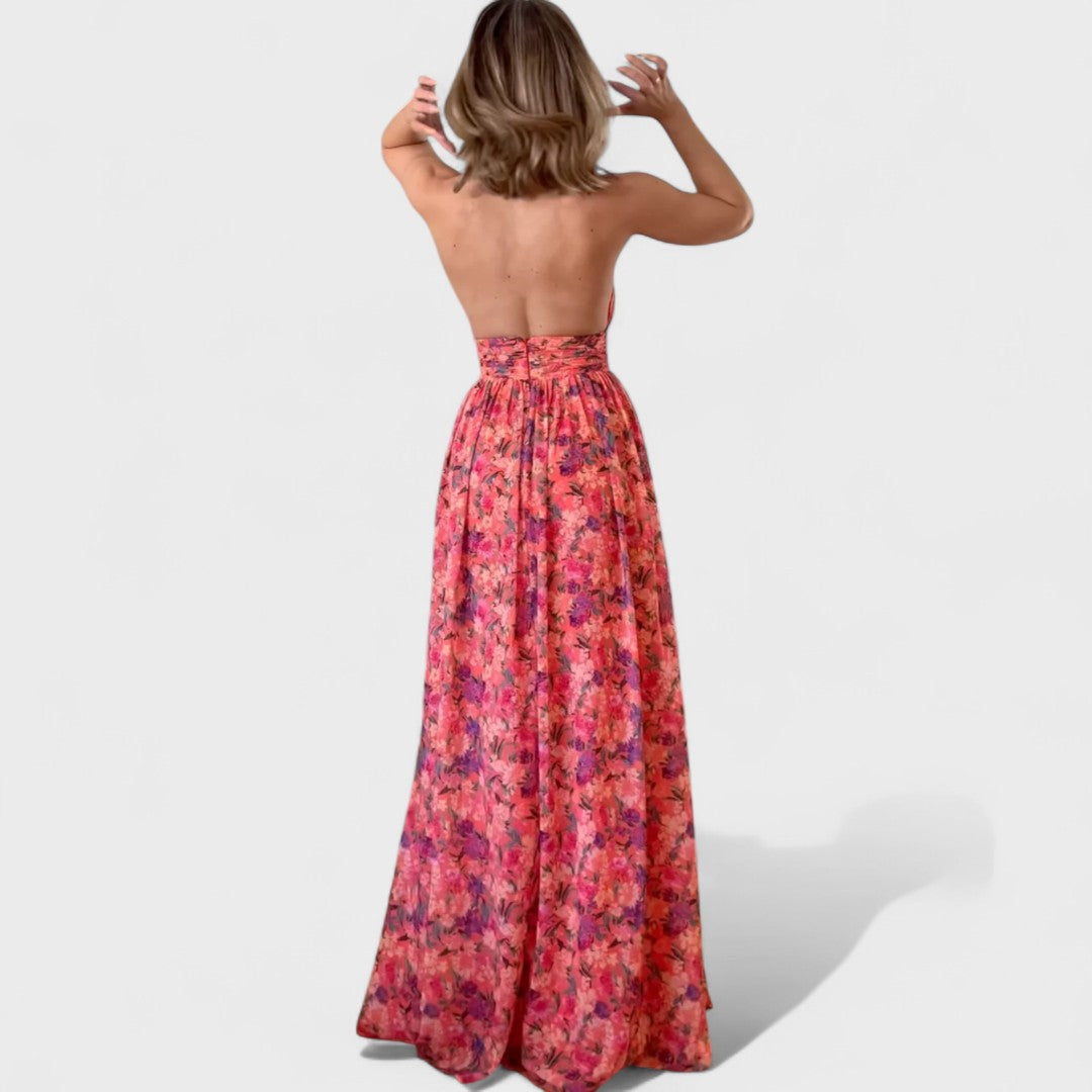 Šaty Monika vynikají svou rafinovanou maxi délkou, květinovým potiskem plným jemných detailů a svůdným designem „bez zadního dílu“, který dodává šatům odvážný, avšak elegantní charakter. Splývavý materiál příjemně hladí tělo, vypasovaný pas podtrhne ženskou siluetu a vytváří hravý pohyb při každém kroku. Perfektní volba pro letní oslavy, romantické chvíle nebo stylové momenty, kdy chceš zazářit.