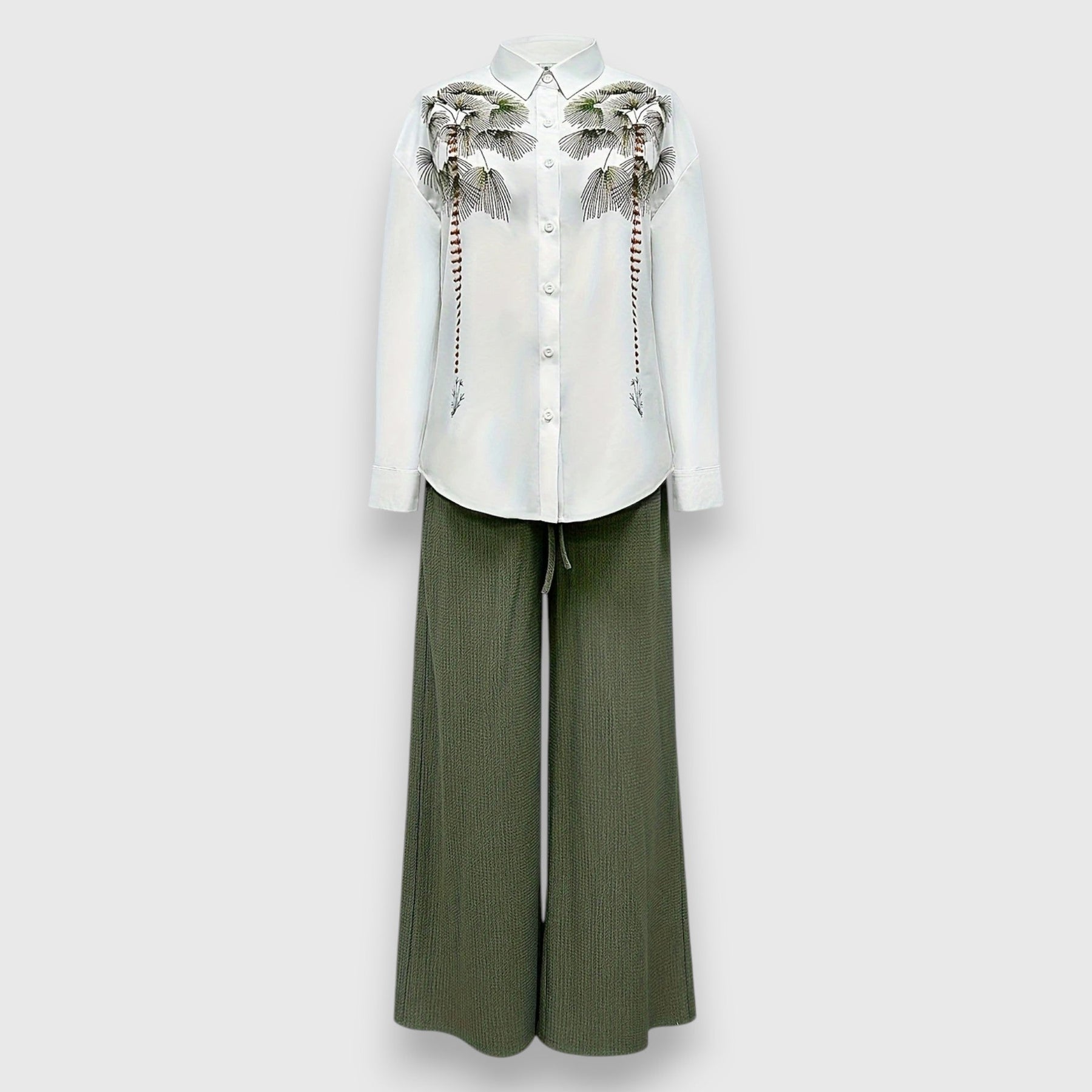 Sada Nivana kombinuje elegantní blůzu s jemným květinovým vzorem a splývavé kalhoty s širokými nohavicemi – ideální pro stylové dny. Lehký materiál a vysoký límec dodávají celku ženský a náročný nádech.