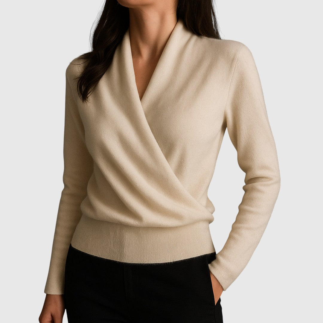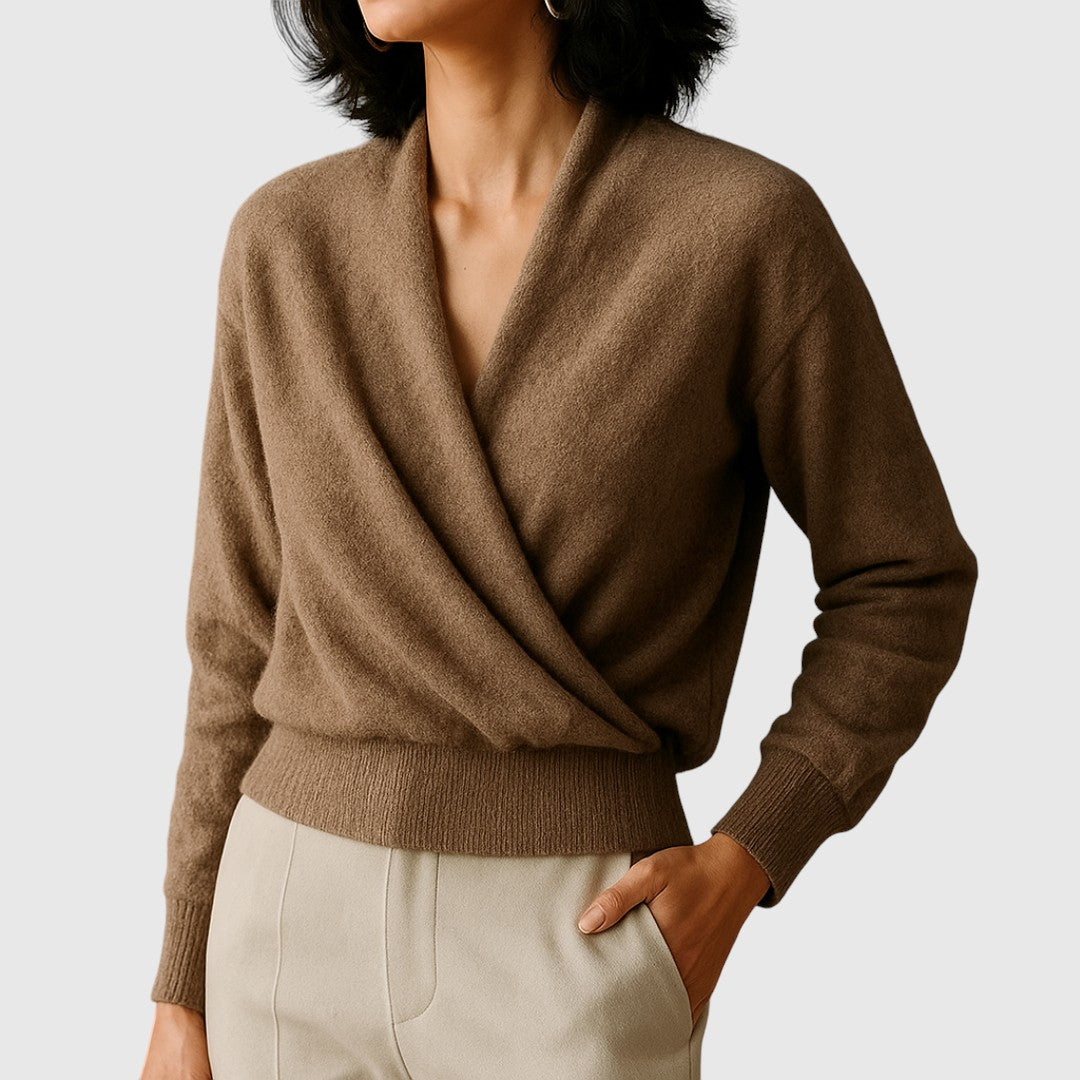 Elegance, která obejme. Elena je zavinovací svetr s výstřihem do „V“ a krásným splýváním, které opticky prodlužuje postavu a povýší každý outfit – od kanceláře po večeři.